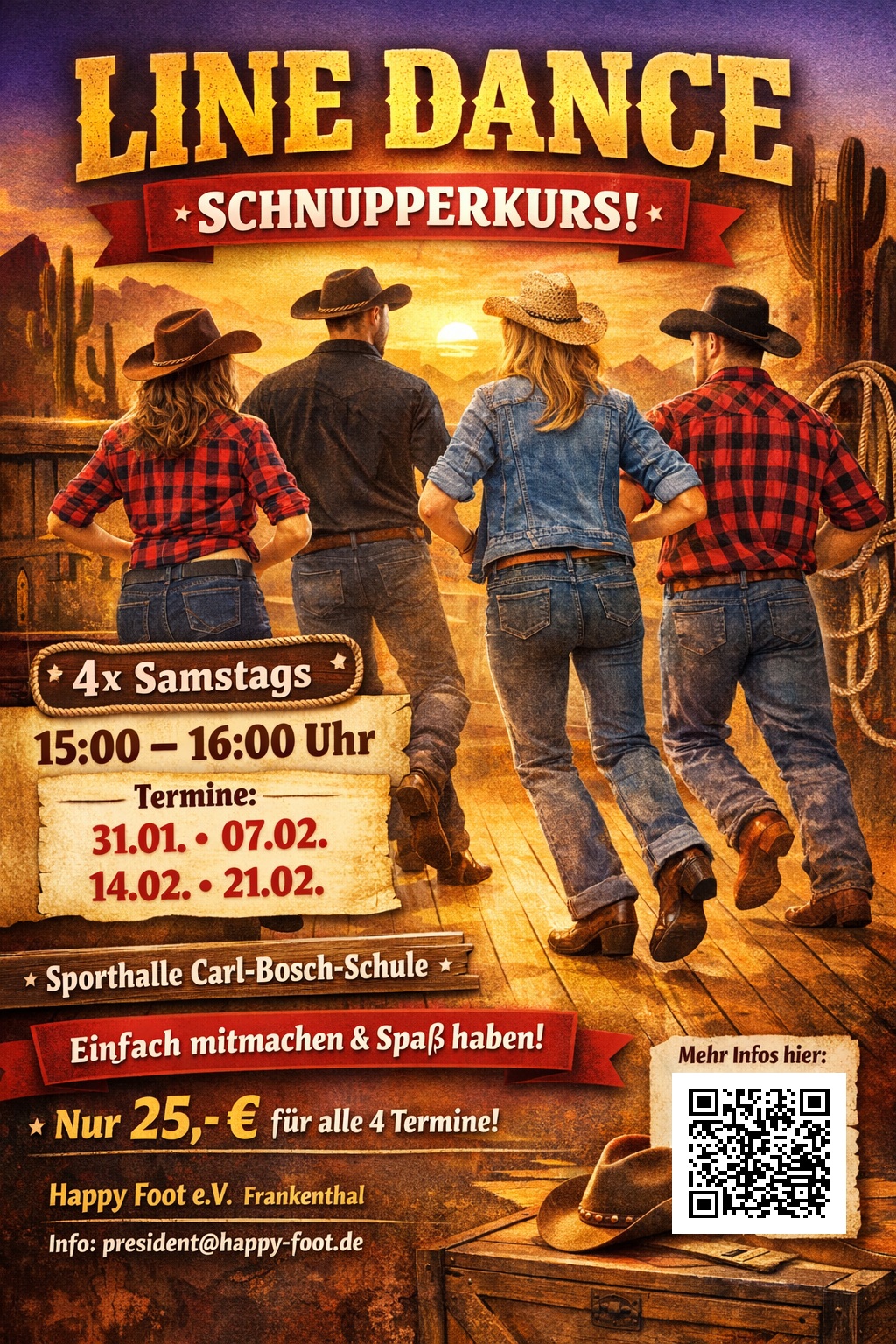 News Nächster Kursstart am 31. Januar 2026!Du möchtest neu einsteigen oder hast schon erste Line Dance Erfahrungen? Dann ist unser Kurs genau richtig für dich! Flyer: Schnupperkurs 31. Januar 2026 📩 Bei Fragen: Dein Name Deine E-Mail-Adresse Betreff Deine Nachricht (optional)